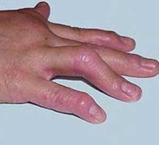 关节型牛皮癣的症状多数常继发于牛皮癣之后,或牛皮癣多次发病后,关节型牛皮癣地的症状恶化而发生关节改变,或与脓疱型牛皮癣或红皮病型牛皮癣并发。这种牛皮癣患者的关节炎可同时发生于大小关节,亦可见于脊柱,但以手,腕及足等小关节为多见,尤以指(趾)关节,特别是指(趾)末端关节受累更为普遍。